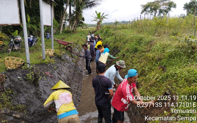 Banyuwangi, Aktualrakyat.com- Aktivitas warga Desa Temuarsi, Kecamatan Sempu, tampak sangat ramai. Belasan masyarakat setempat turun langsung ke saluran irigasi untuk mengangkat endapan lumpur, memotong rumput liar, dan memperbaiki beberapa bagian dinding saluran yang mulai tertutup sedimen. Kegiatan ini merupakan salah satu bentuk aksi nyata Program Padat Karya yang dijalankan oleh Dinas PU Pengairan Banyuwangi.